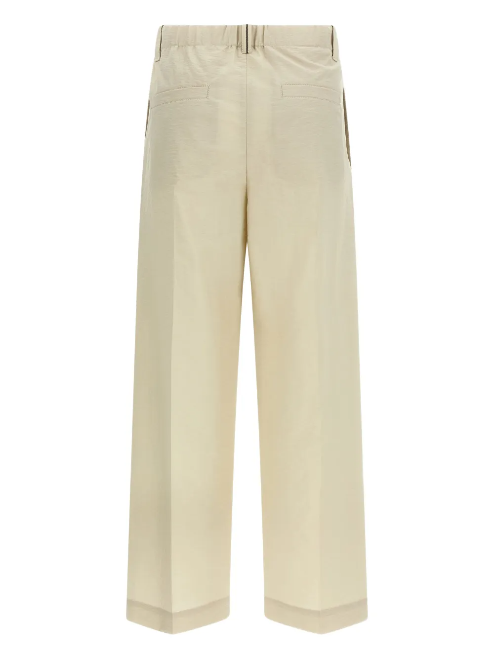 These cotton poplin A-line trousers represent a balanced mix of tailored details and casual style. The front pleats give the design a clean silhouette for an impeccable fit. The lines start off regular and progressively widen along the leg, bringing to mind the proportions of traditional palazzo trousers. The shiny monili detail completes the garment with a feminine sparkle in true Brunello Cucinelli style.