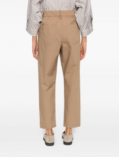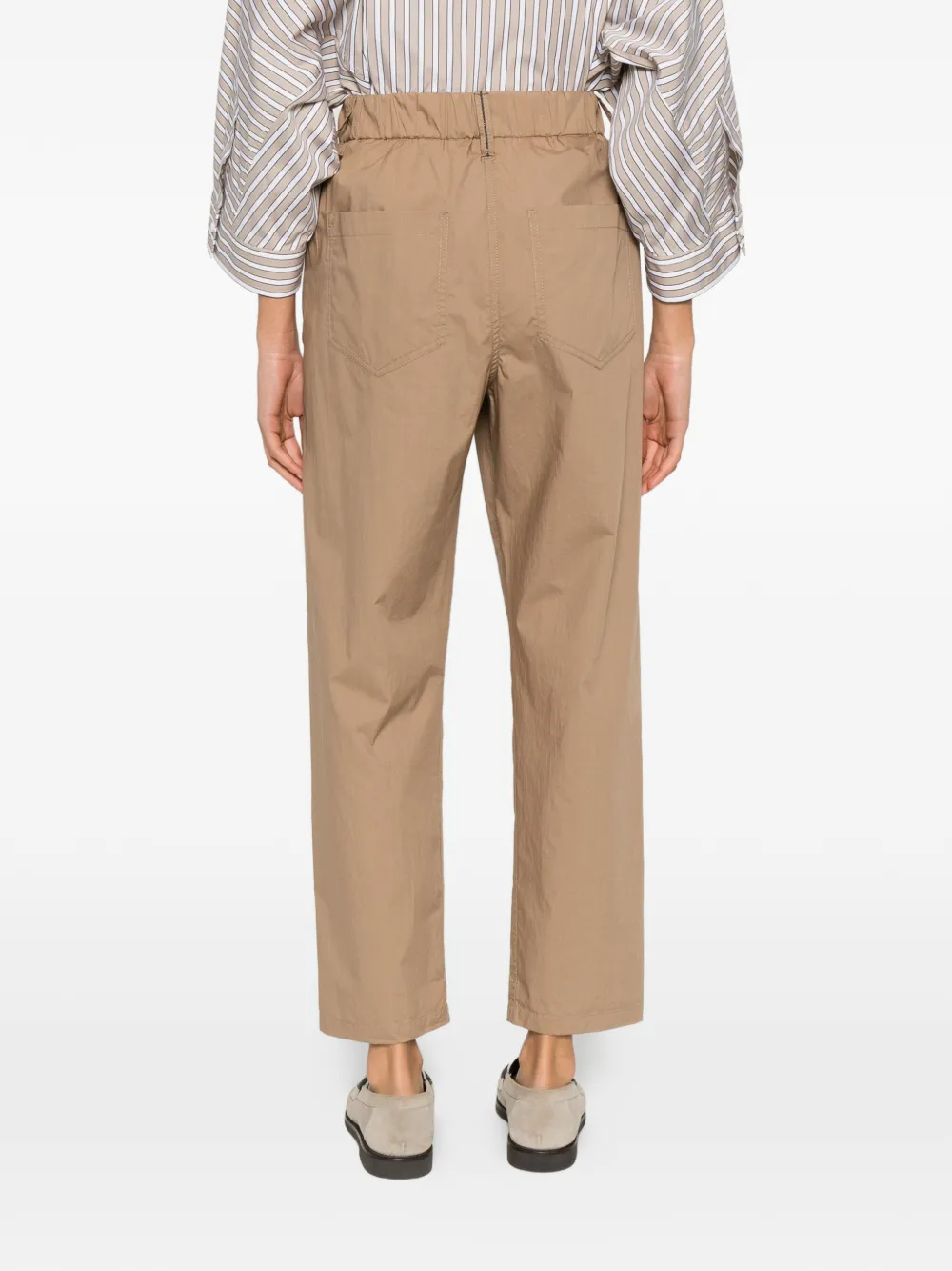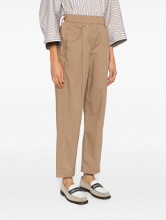 The distinctive materials of the Brunello Cucinelli collections define these five-pocket Track trousers. A classic fabric from the world of shirting, cotton poplin enhances the garment’s casual, summery style, characterized by a soft silhouette and a practical elasticized waistband. A precious monili embroidery enriches the garment with a refined, feminine sparkle.