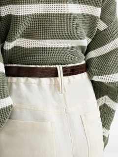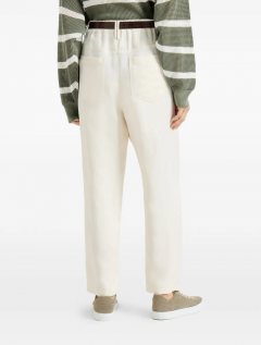 Refined Brunello Cucinelli materials enrich the casual volume of these baggy trousers. Inspired by classic five-pocket denim designs, the garment features a relaxed cut in the seat and down the leg, complemented by the crisp, lightweight texture of viscose and linen fluid twill. A delicate shiny monili embroidery on the rear belt loop adds a note of feminine sparkle.