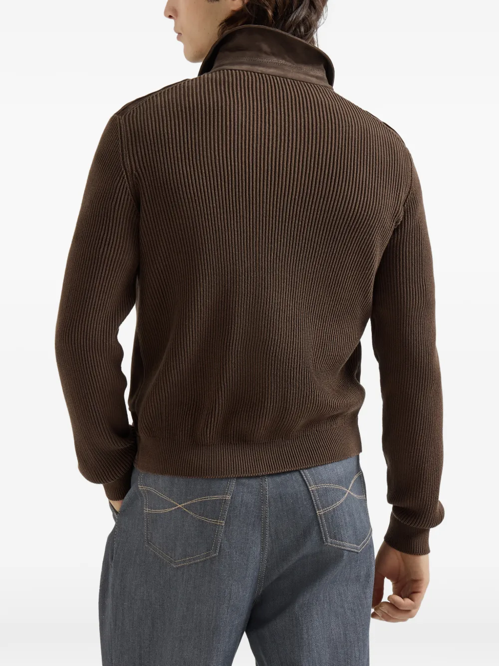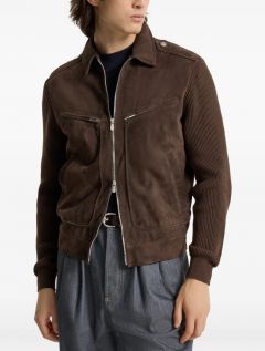The combination of iconic textures enrich the style of this zip-front outerwear jacket with the excellence of Brunello Cucinelli materials. The front of the garment is made of refined suede, while the sleeves, the inserts on the edges, and the back are detailed in soft cotton knit for a sophisticated material contrast. The silhouette offers regular proportions that are slightly shorter on the side.