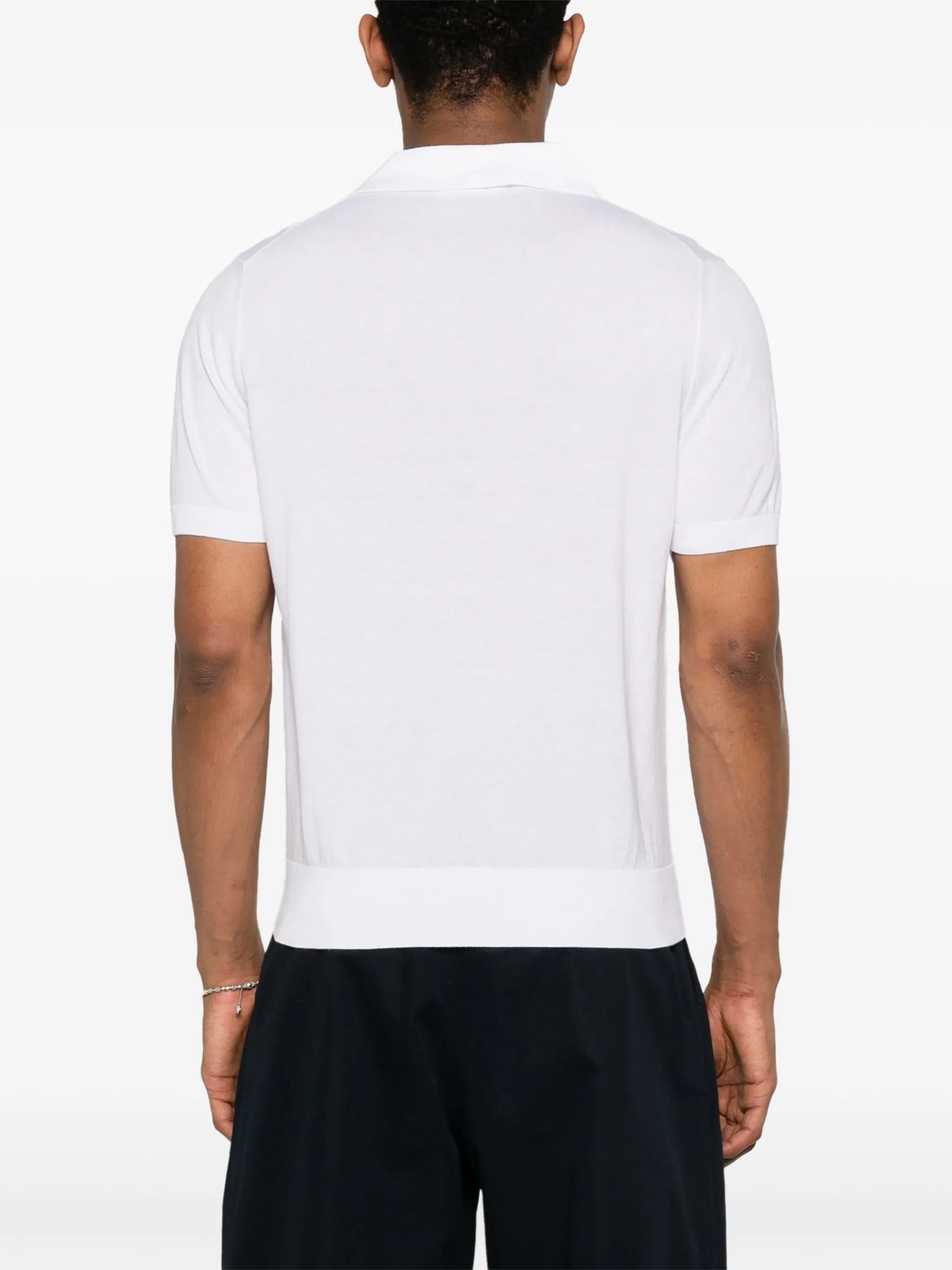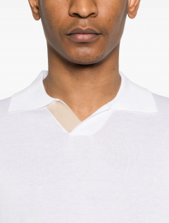 In an extra-fine plain knit cotton blend, this open collar polo shirt is the epitome of refinement. The ribbed collar, hem and sleeves, the delicate colour scheme and the leather inserts bring an elegant and sophisticated appeal to the design.