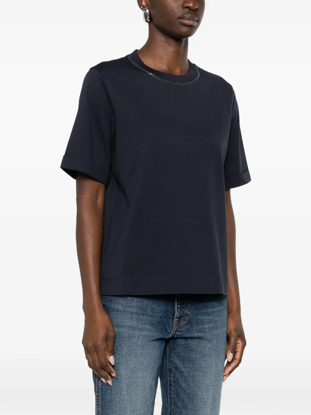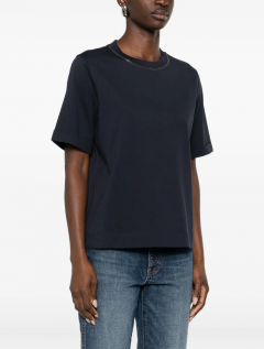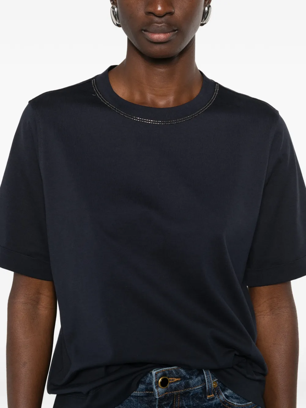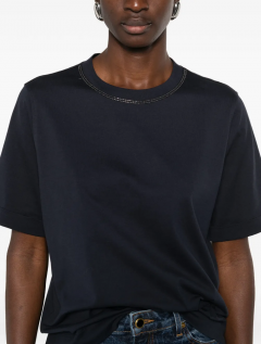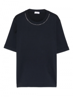 Precious embellishments elevate the essential look of this cotton jersey T-shirt. The silhouette offers comfortable, regular volume, while a delicate monili detail stands out on the crew neck, showcasing the iconic embroidery of the Brunello Cucinelli collections, completing the garment with a feminine, sparkling note.